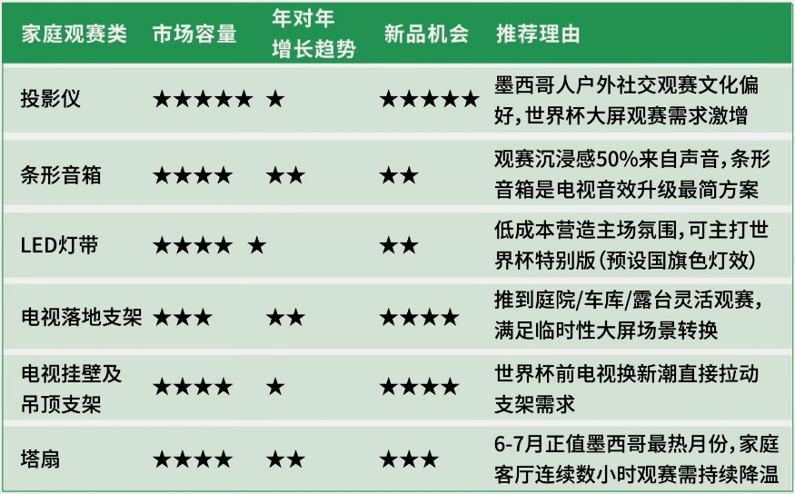 墨西哥是本届世界杯主场,年轻群体较多,可以重点关注体育服饰、家庭娱乐、派对装饰产品等。