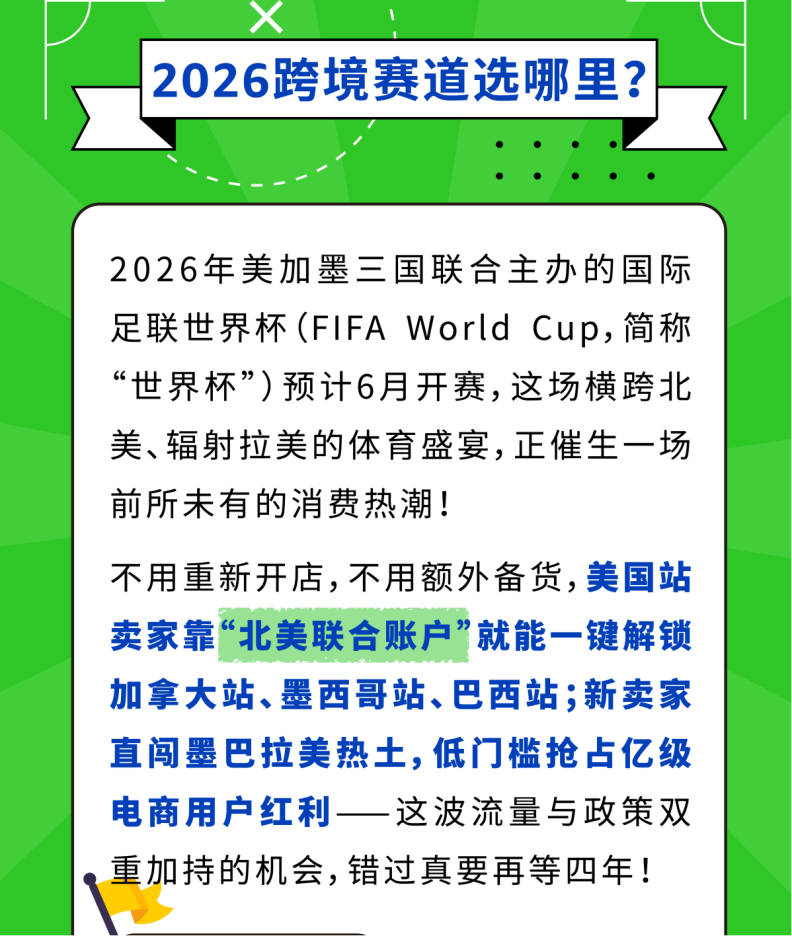 2026年的跨境风口,就在美加墨!世界杯带来的消费热潮+亚马逊的重磅扶持,美国站卖家抓紧用北美联合账户测款布局,新卖家趁红利期快速入场,解锁世界杯专属商机!