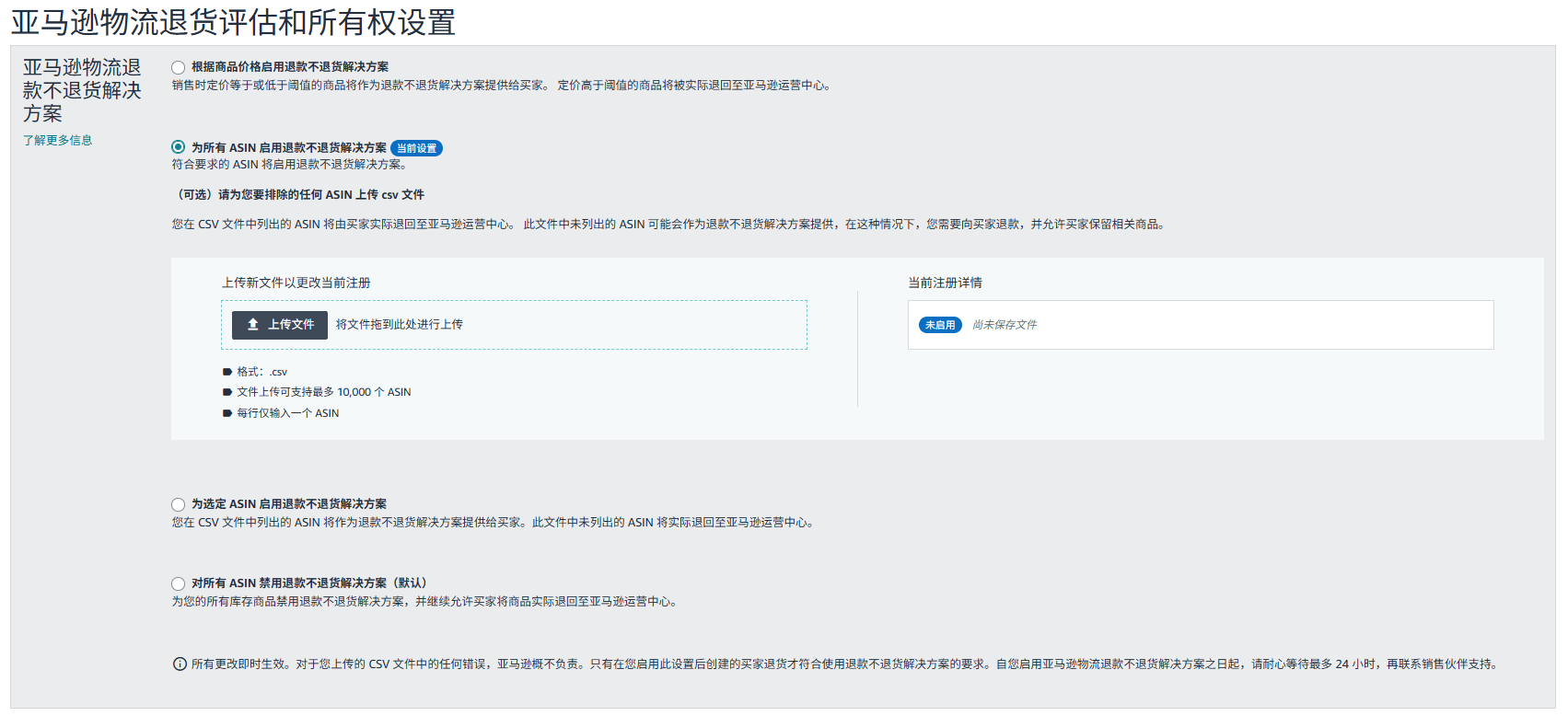 自定义某些ASIN启用退款不退货。则未列出的ASIN,则必须正常退回FBA仓库。这种方式适合:想精细化管理退货策略的卖家以及只针对部分低价商品开启该功能的卖家。