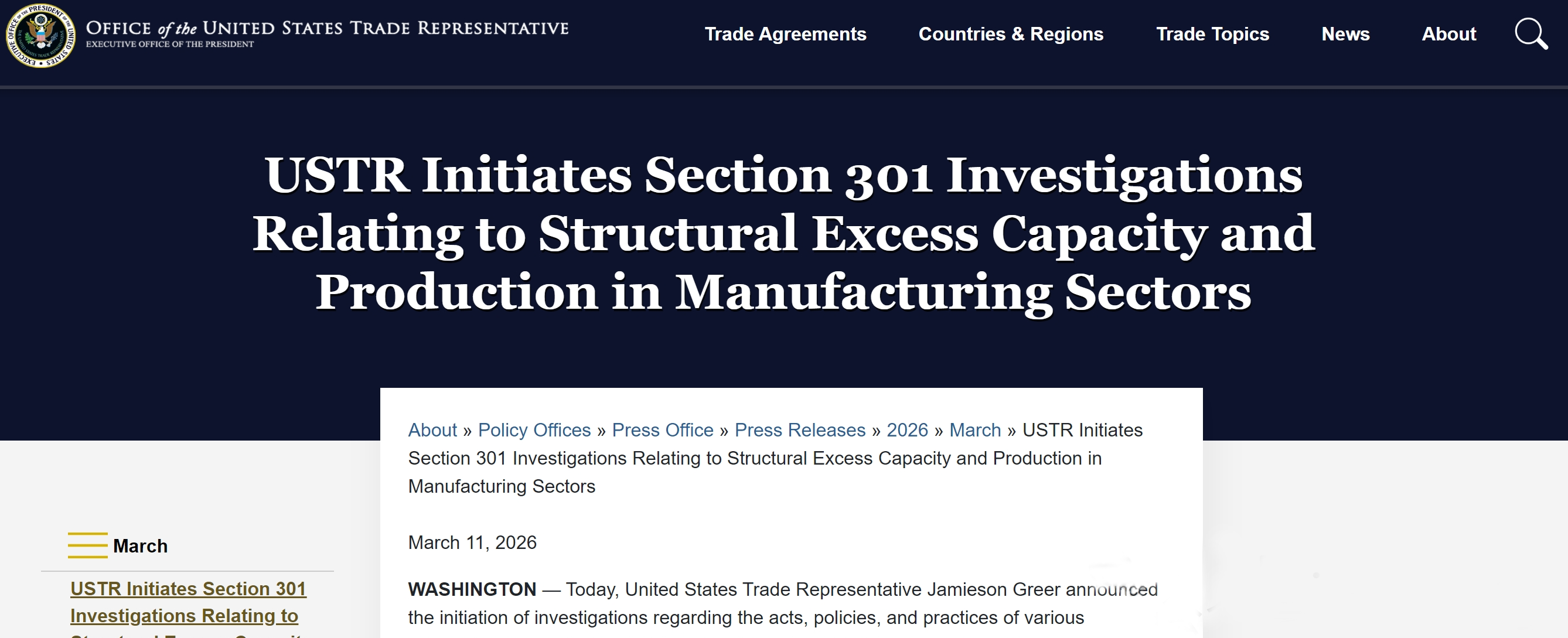 调查理由更加“深化”:此次调查聚焦于制造业产能过剩,重点审查各经济体在制造业领域的产能与生产政策,判断其是否存在不合理或歧视性行为,并评估是否对美国企业造成负担或限制。