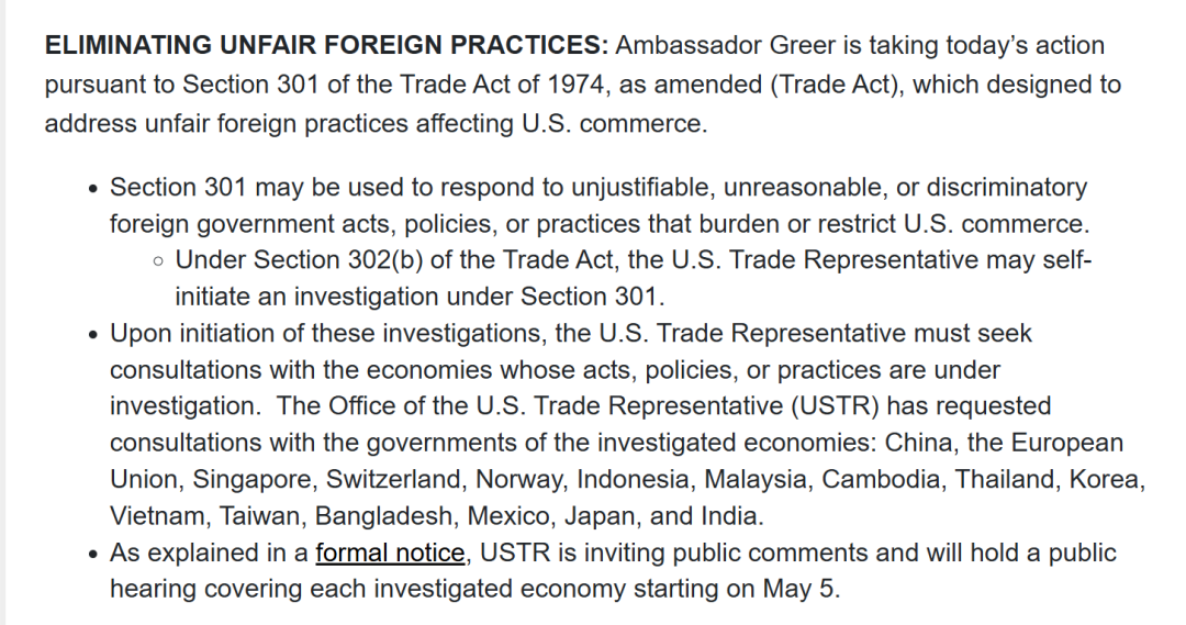 根据USTR公布的法定流程,本轮301调查已进入公众意见征集阶段,5月5日起将举行公开听证会,美方或于7月下旬形成最终调查结论。