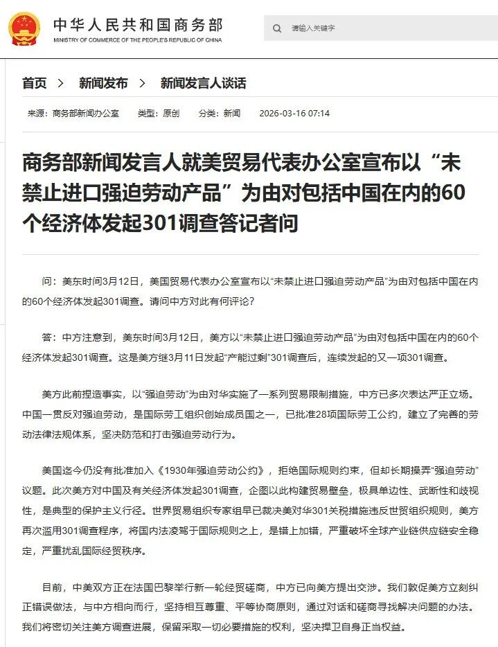 答:中方注意到,美东时间3月12日,美方以“未禁止进口强迫劳动产品”为由对包括中国在内的60个经济体发起301调查。这是美方继3月11日发起“产能过剩”301调查后,连续发起的又一项301调查。
