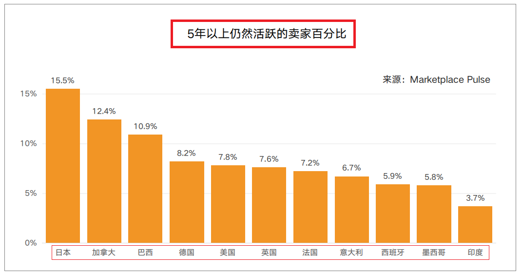 就是下面这组数据:5年以上仍然活跃的亚马逊卖家百分比,美国站只有7.6%!