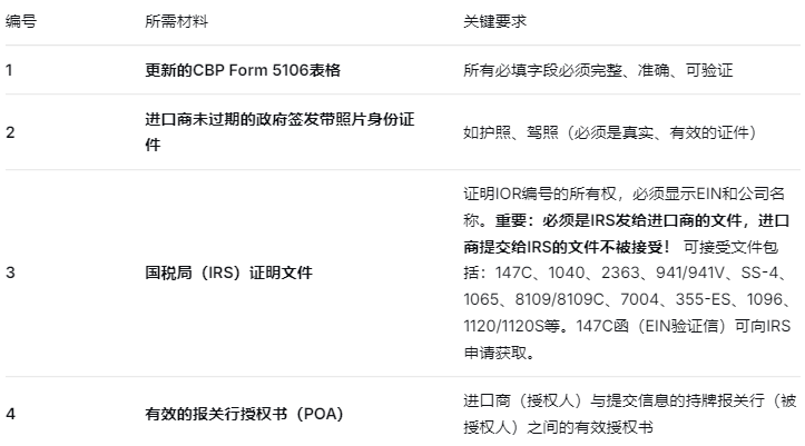 ● IRS官方权属证明文件:由美国国税局(IRS)直接向IOR出具,需体现EIN和公司名称,进口商向IRS提交的文件不被接受,可接受的文件包括147C、1040、2363、941/941V、SS-4、1065、8109/8109C、7004、355-ES、1096和1120/1120S。如有需要,可向IRS申请EIN验证函(147C信函);