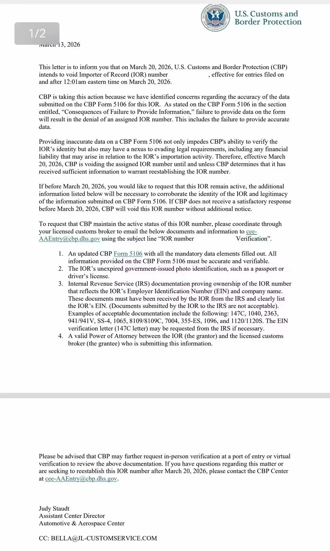 美国海关与边境保护局(CBP)新成立的部门正在对大量进口商记录(IOR)进行集中核查。邮件核心内容:2026年3月20日(东部时间)起,你的IOR编号将被正式作废。