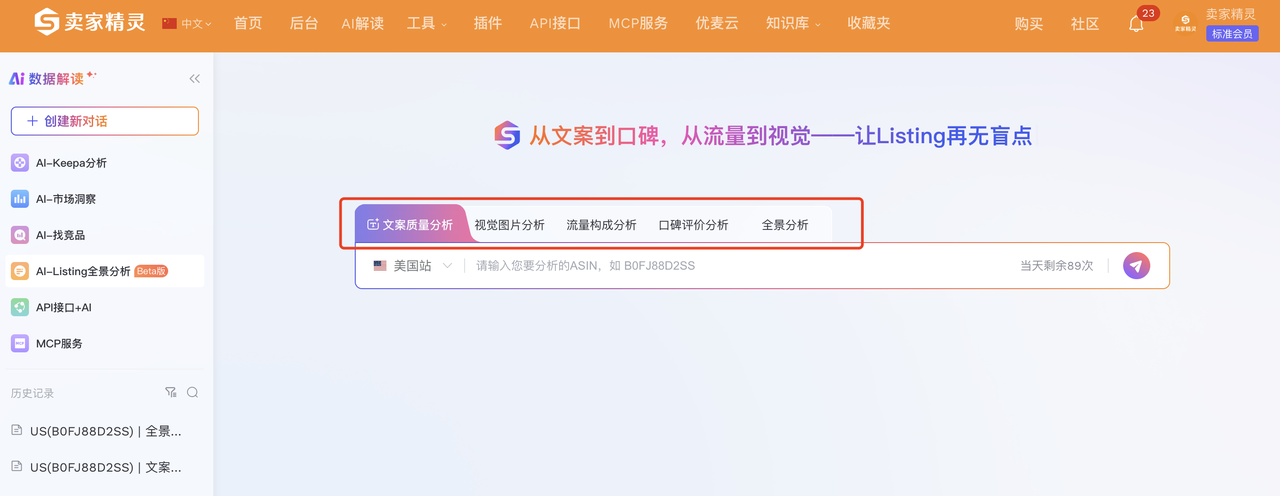 卖家精灵这次把这件事做成了一个一键体检:AI Listing全景分析。 它不是“再给你一堆建议”,而是直接给你一份能落地、带优先级的 ASIN 会诊报告。