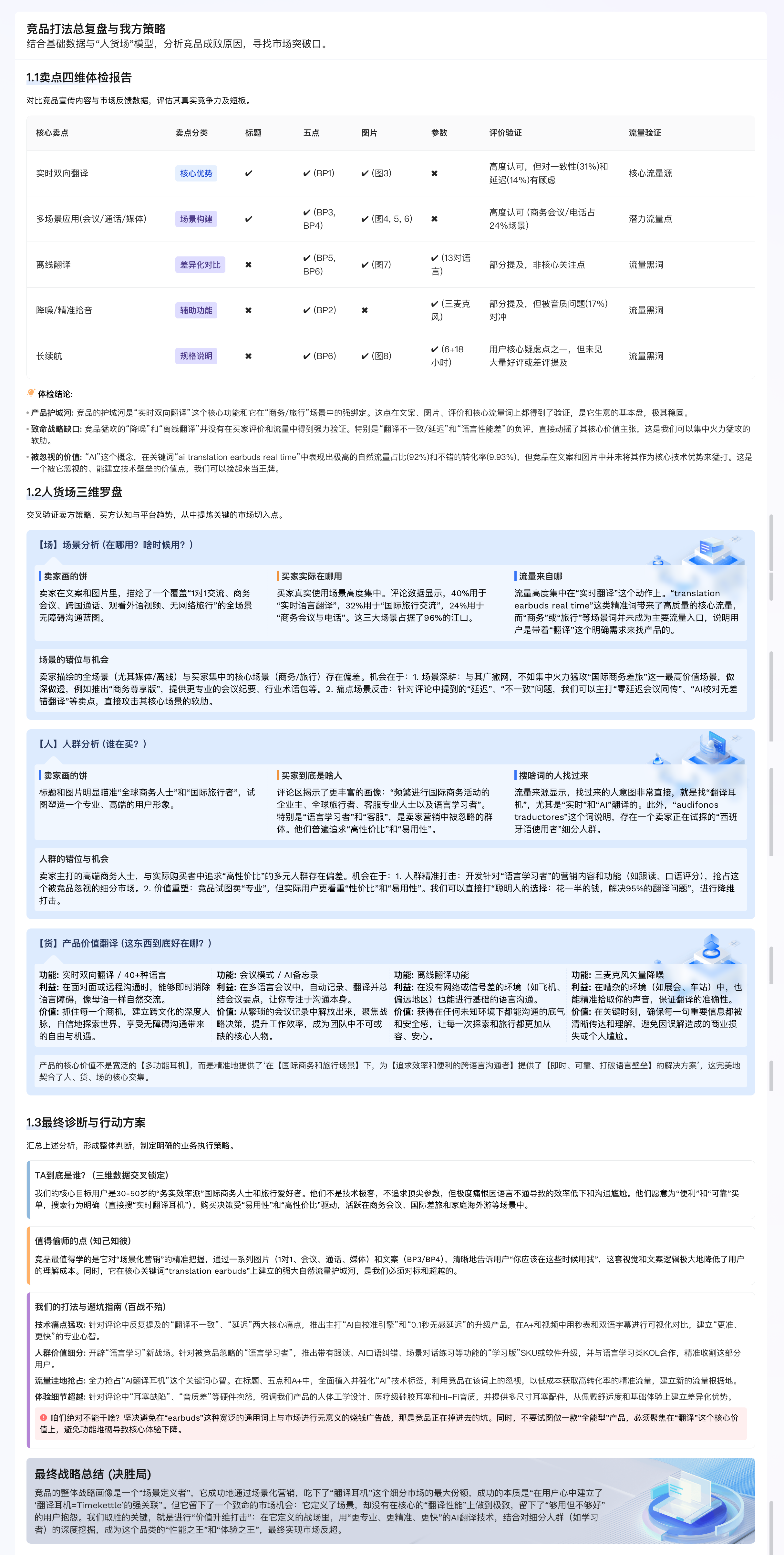 打法复盘与建议:总结竞品策略(低价跑量/品牌溢价等),并给你可执行的攻防动作。