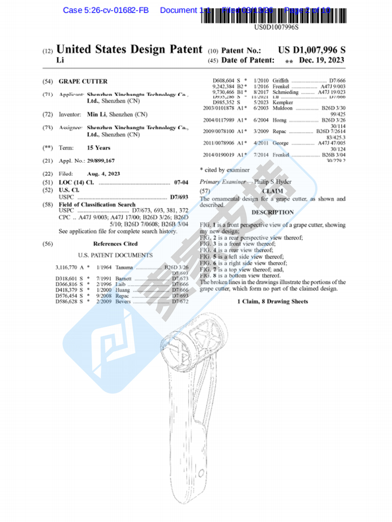 3月13日,Shenzhen Xinchangtu Technology Co., Ltd.委托AVEK律所,在德克萨斯州发起专利维权诉讼,目标直指其专利号为D1007996的明星产品,Grape Cutter葡萄切片器未经授权使用的侵权行为。