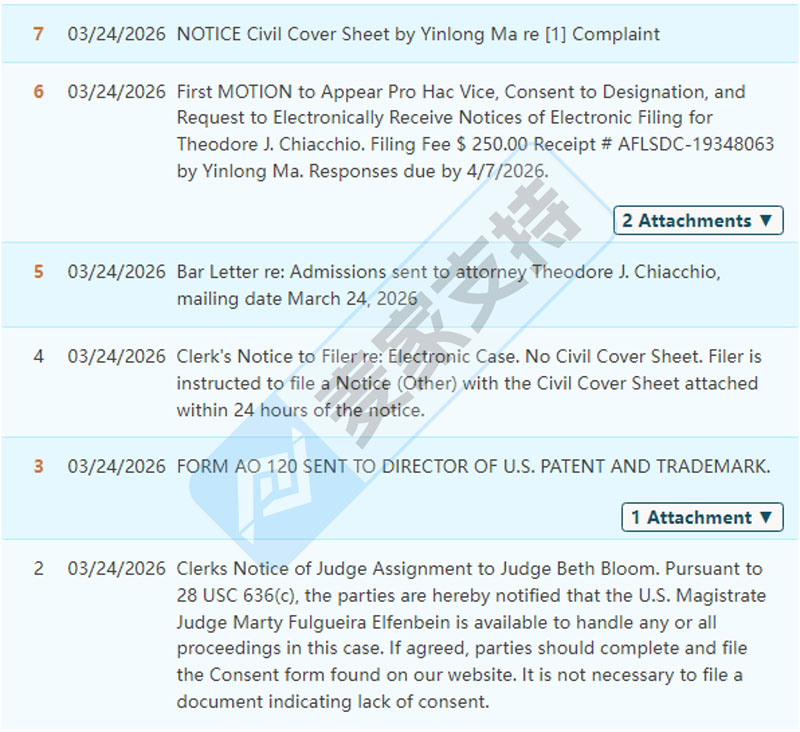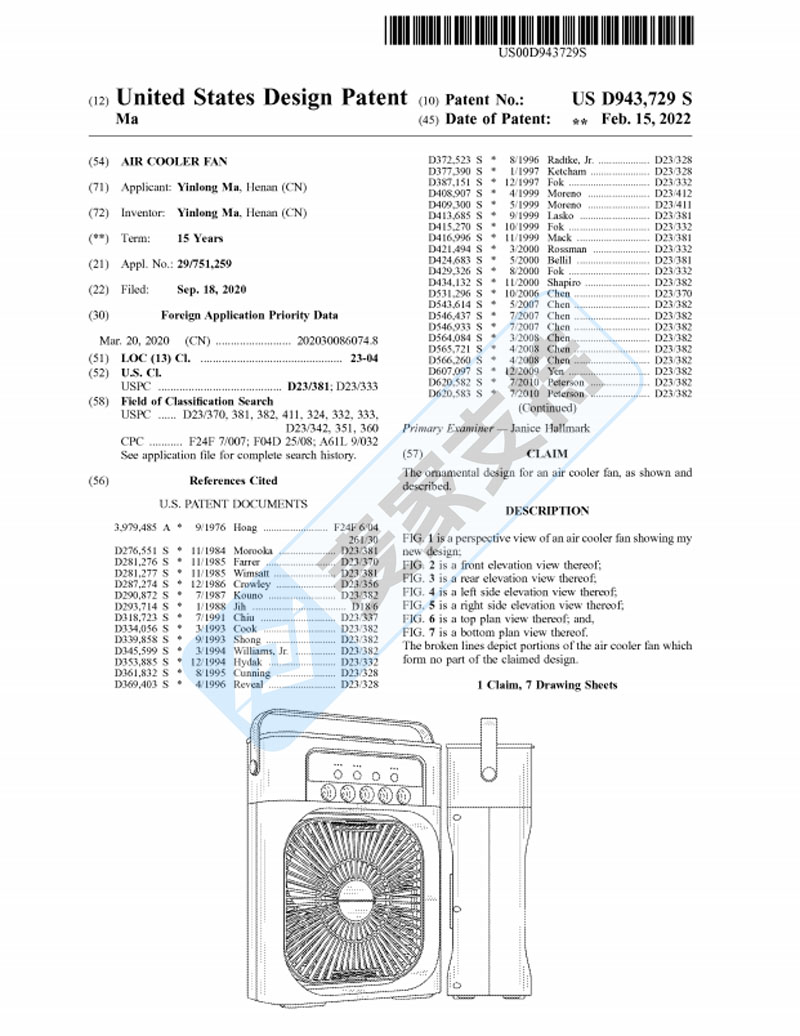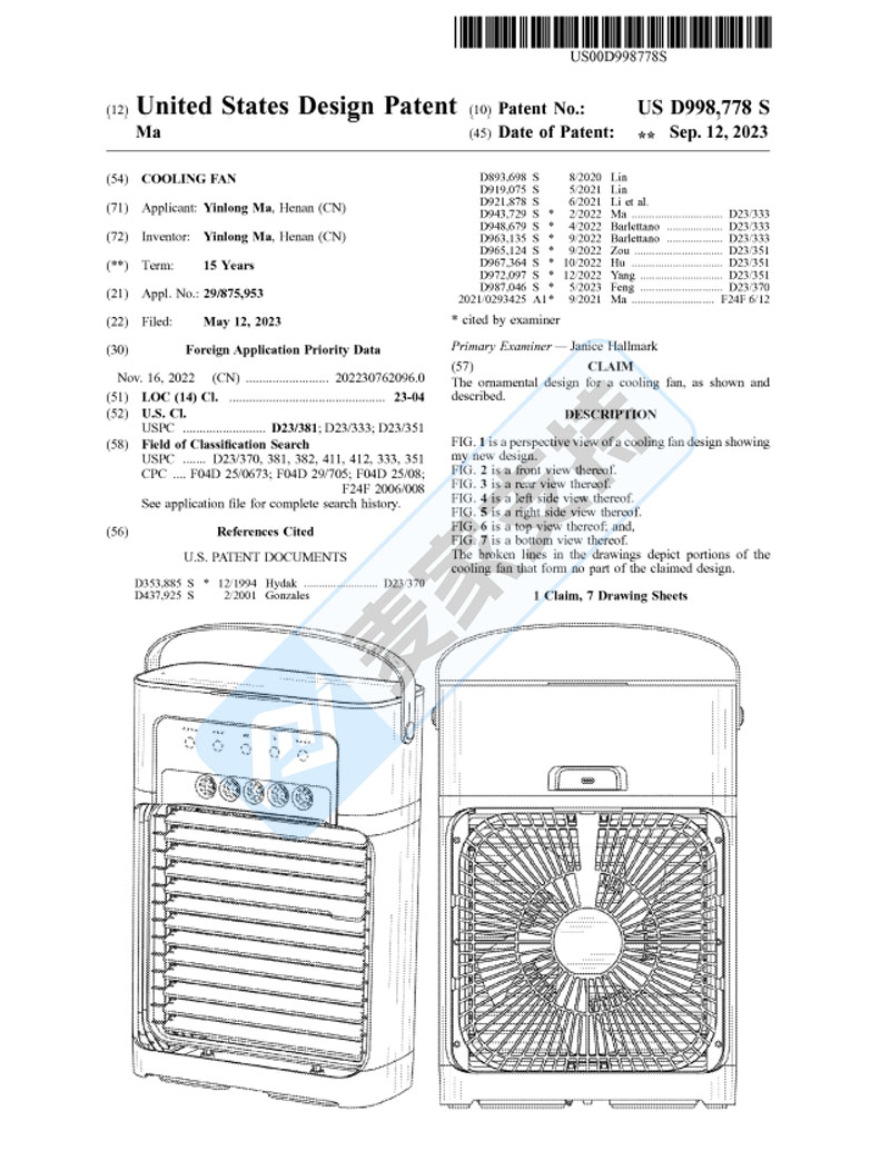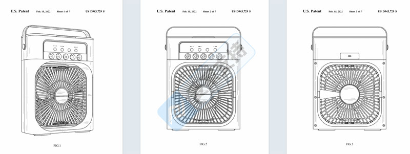 本案是Chiacchio IP,LLC代理国人卖家Yinlong Ma发起的专利维权案件,涉案专利号为D943729的 便携式冰风扇冷风机,由Yinlong Ma于2020年9月18日向美国法院提交专利申请,并于2022年2月15日获得外观专利认证。除此之外,麦家支持通过排查发现,该原告名下还注册有一款专利号为D998778的冷却风扇外观专利,跨境卖家在选品时均需注意侵权风险,避免账户资金被TRO冻结!