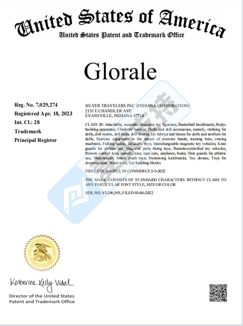 本案是Getech律所代理Silver Travelers Inc.发起的商标维权案件,涉案商标Glorale,注册商标号为7029274,该商标注册在第28大类,涵盖玩具及配件、健身器材训练杠、划船机、可互换磁性玩具车辆、滑板、智能毛绒玩具、玩具无人机、上游乐设备以及玩具积木等多个类目。本次案件原告仅起诉了一名被告的侵权行为,但麦家支持建议跨境卖家在选品时需注意规避,避免后续侵权风险!
