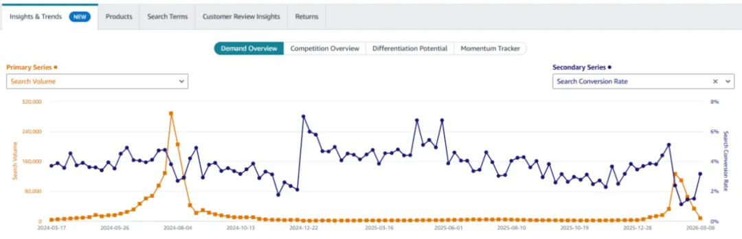 用亚马逊「商机探测器」,输入关键词输入“Olympic Decoration”发现:和球迷服饰一样,在2024年奥运期间搜索量暴增,但热搜持续时间更长。