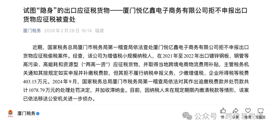 更可怕的是,这家公司用的套路,在跨境电商圈并不罕见。今天,我们就来深度拆解这个典型案例,看看在金税四期全面上线的今天,跨境电商老板们该如何避免重蹈覆辙。 案例拆解:2.28亿与2000元的荒诞差距 事情要从一次数据比对说起。税务部门在例行分析时发现了惊人的数据矛盾:厦门悦亿鑫电子商务有限公司在2021年至2022年间,以“跨境电商”模式出口镀锌钢板、钢管等货物,海关数据显示出口额高达2.28亿元,但其纳税申报表上收入仅填了2000元。 核心问题一:货物性质特殊 该公司出口的镀锌钢板、钢管属于“两高一资”产品。根据《财政部 国家税务总局关于出口货物劳务增值税和消费税政策的通知》等规定,这类取消出口退(免)税的货物,不适用免税政策,必须按规定在出口环节申报销售收入并缴纳增值税。而该公司错误地以为所有跨境电商出口都能免税。 核心问题二:经通知而拒不申报 主管税务机关多次沟通并依法送达《责令限期改正通知书》,要求其补报补缴。但该公司在限期内拒不进行纳税申报,并最终“走逃失联”。根据《税收征收管理法》第六十三条,这种行为已构成偷税。 最终结局:补税+罚款+移送公安 经查,该公司需补缴增值税、企业所得税等税费共计403.15万元。税务机关依法作出追缴税款、加收滞纳金并处0.5倍罚款的决定,合计1078.79万元。因逾期未缴清,案件已移送公安机关侦办。