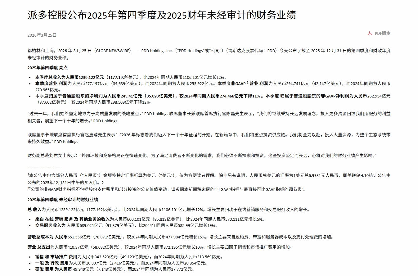 表面上看,它像是一个新项目。再往里看,它其实更像拼多多在下一个阶段的一次战略试探。3月25日,PDD Holdings披露2025年第四季度及全年业绩,全年营收4318亿元,同比增长10%,但净利润同比下降12%。同一轮公开信息里,管理层把“重投供应链”摆到了很高的位置,强调2026年会把供应链投资放在更关键的位置。几乎同时,公开报道显示,“新拼姆”已在上海成立专项公司,一期注资150亿元,未来三年计划投入1000亿元,方向直指品牌自营与供应链整合。