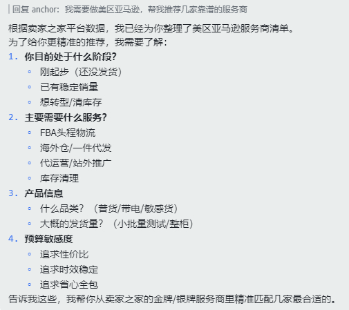 对于服务商而言,这意味着什么?你的潜在客户,可能正在通过AI智能体面试你。当卖家问AI哪家美国专线物流性价比高时,AI会调取卖家之家入驻服务商的数据进行推荐——没有入驻?那你连被面试的机会都没有。