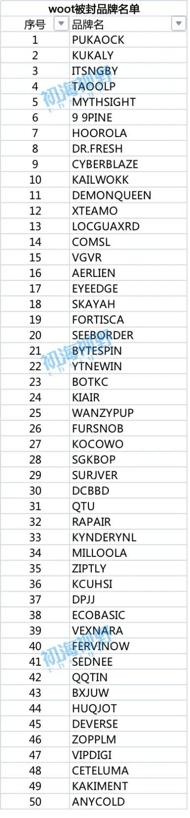 以下是《WOOT被封品牌列表汇总终版》列出的前50个品牌,完整版名单请关注公众号“初海视野”,微信后台回复“woot”获取这份品牌名单。