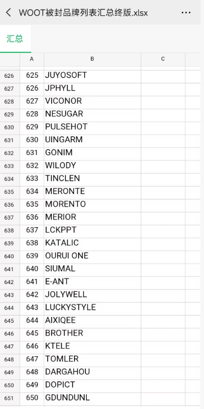 今早,一份名为《WOOT被封品牌列表汇总终版》的文件在跨境圈内疯狂传播。这份疑似由内部流出的名单详细列出了多达824个被严惩的品牌。