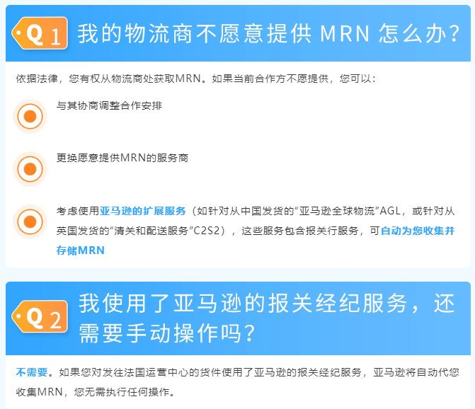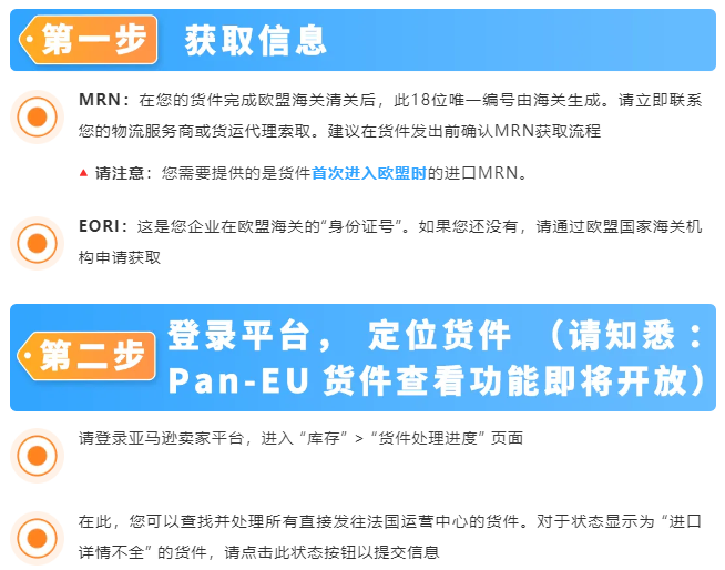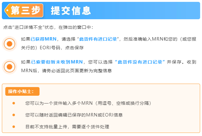 请为您符合条件的货件,在卖家平台提交MRN和EORI信息。