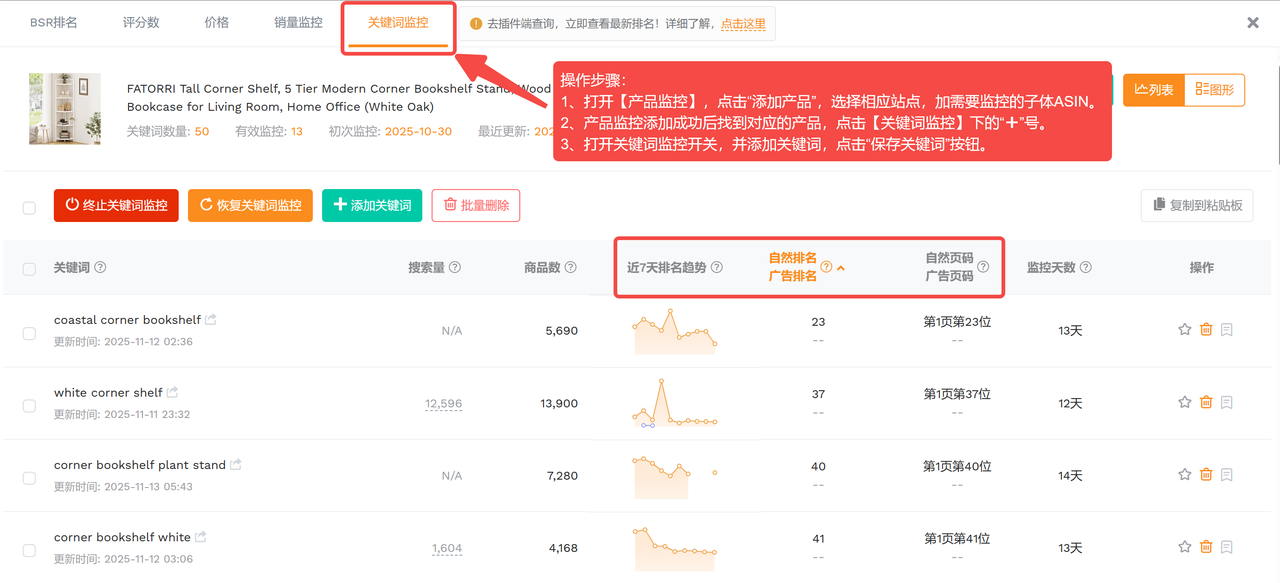 工具应用: 利用卖家精灵的【关键词监控】功能,每日自动追踪主推关键词的真实排位变化。