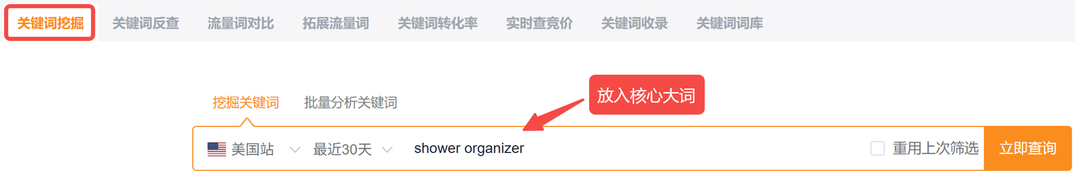 操作: 重点投放竞争较小、购买意图强烈的精准长尾词。这些词可以通过卖家精灵的【关键词挖掘】功能,输入核心词后一键获取,帮助您快速锁定高潜力关键词。