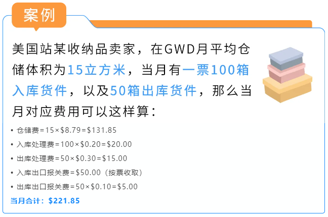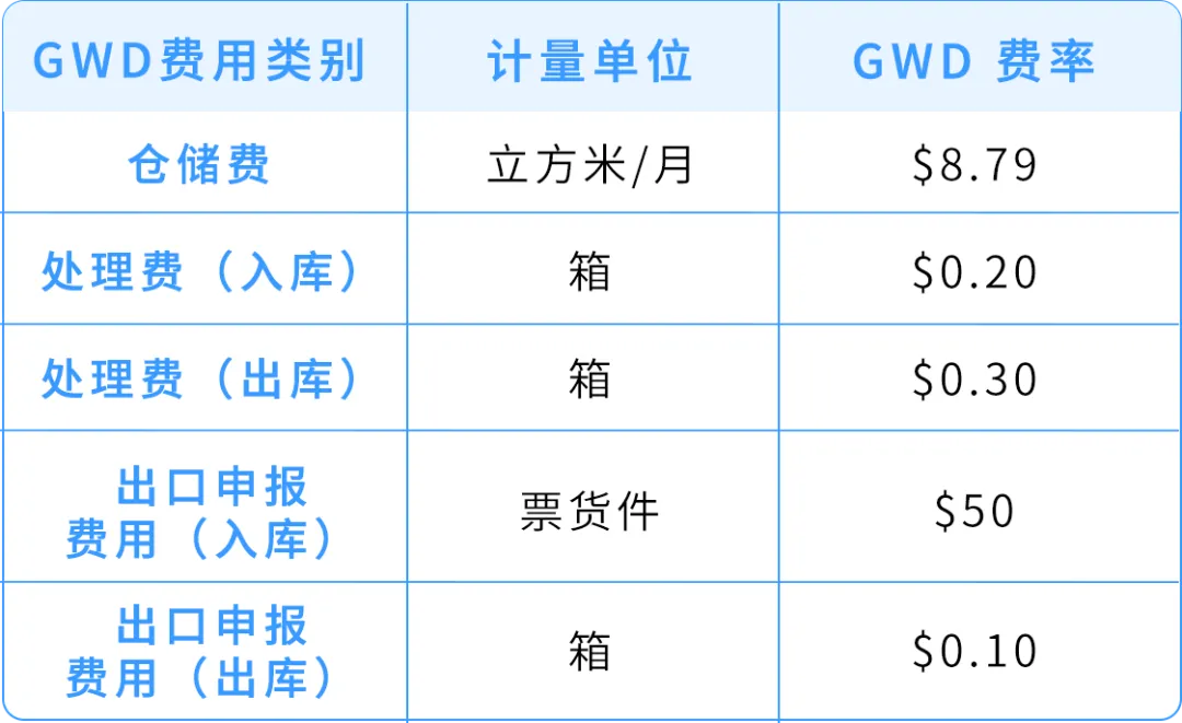 GWD的具体费率标准如下,您可以根据自己的库存体积、入仓箱数和出仓箱数,提前预估整体成本: