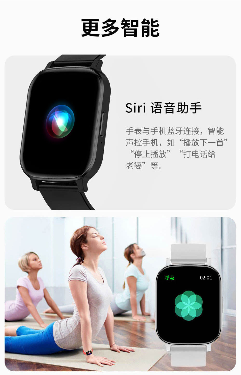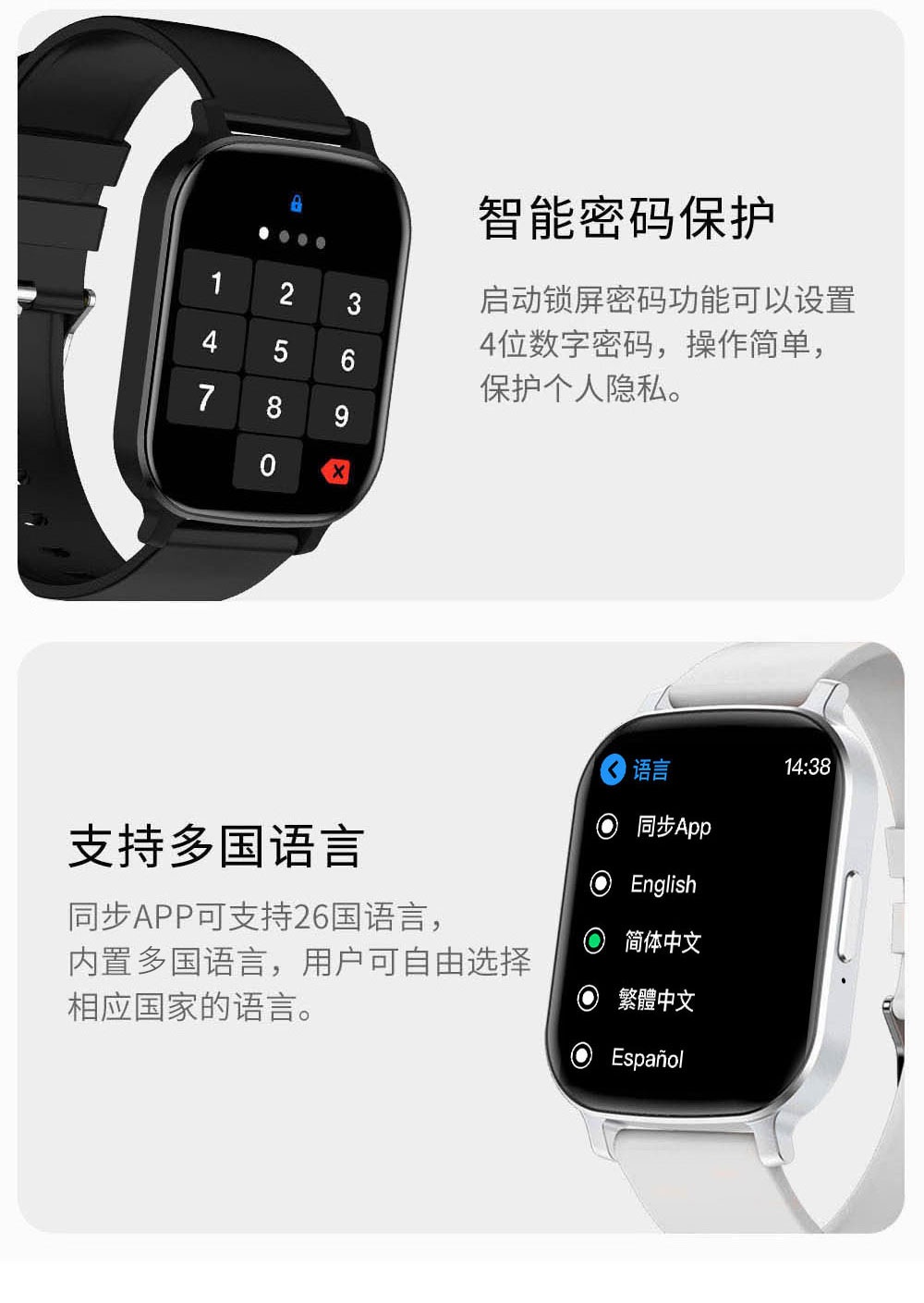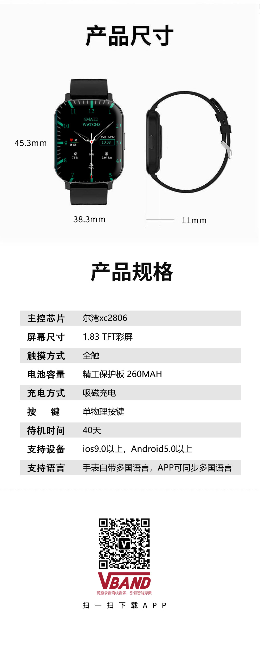 优势功能:一键智能录音笔、录音记事本、本地离线音乐、音乐无线传输、语音播报(只有英语)、蓝牙通话、 超低功耗,消息提醒,1000+通讯录;
